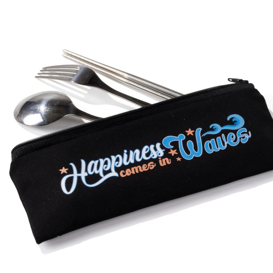 帆布製成的環保餐具收納拉鍊袋(供您自備環保筷 湯匙 & 叉子),也可以用做為文具筆袋或是小物收納袋,是環保實用的最佳廣告贈品,本商品同時提供本白帆布及黑色帆布兩種顏色的選擇。