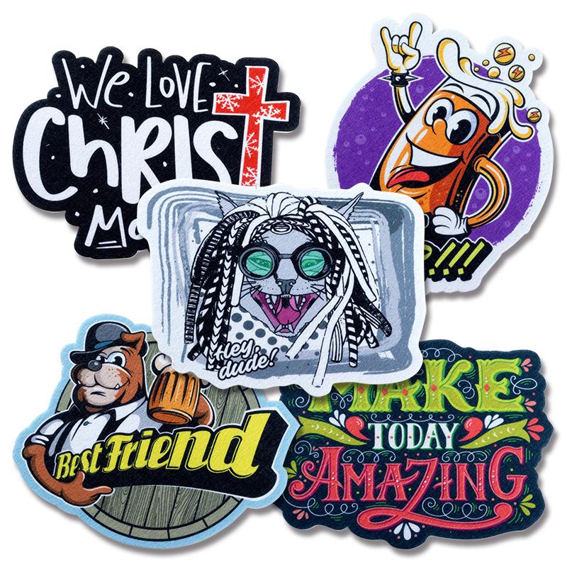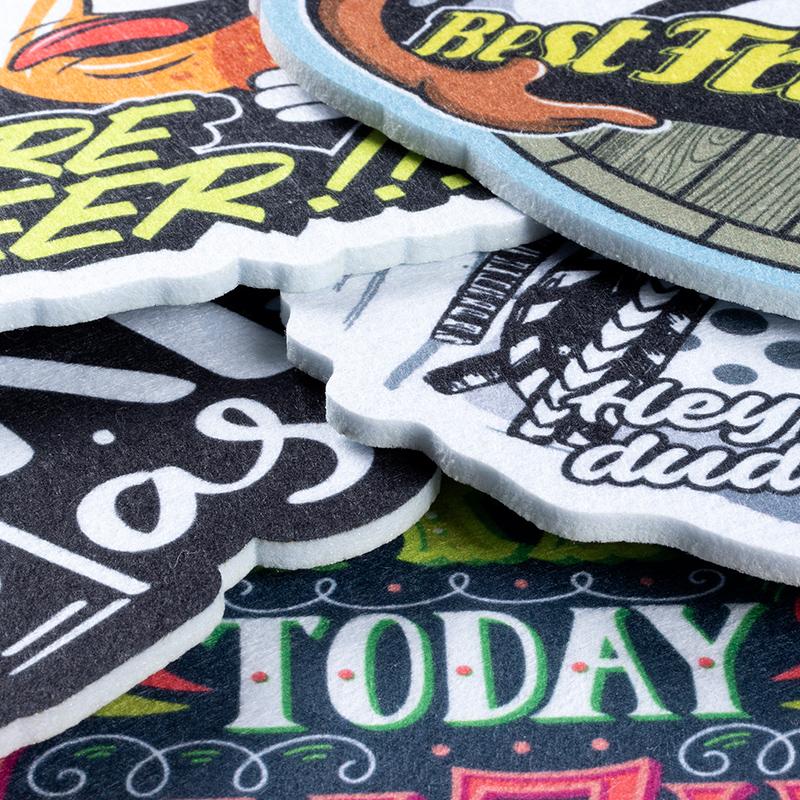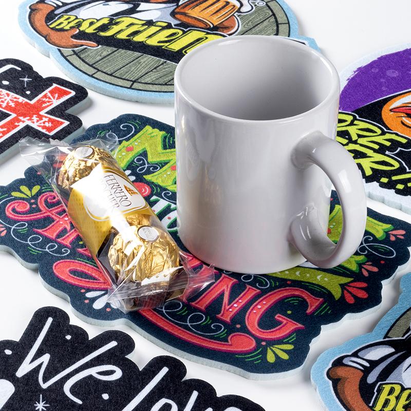 5mm厚的白色造形切為客製化隔熱墊或坐墊,毛氈布表面可以滿版全彩昇華熱轉印印上您的全彩圖案商標;自由造形約22x16.5cm範圍內,廣告面積大,CP值高,也可做為滑鼠墊、坐墊...等商品,毛氈布材料是從塑料瓶回收的滌綸織物,是具有環保意義的商品。