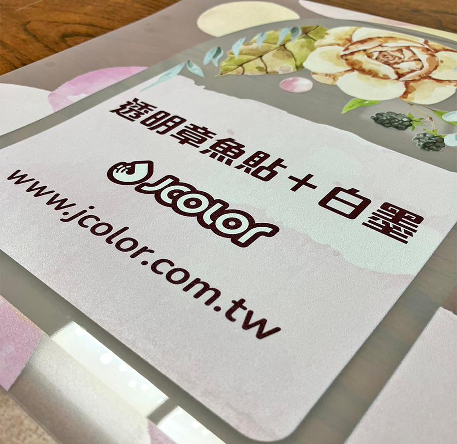 本商品具有不殘膠的特性,可以重複隨意黏貼,可水洗。適合室內環境使用,可黏貼於玻璃、磁磚、壓克力及金屬面板等光滑表面的材質,提供白墨加工,最大輸出寬幅120cm,製作大尺寸較容易產生四角捲曲,建議製作尺寸在100cmx100cm以下。