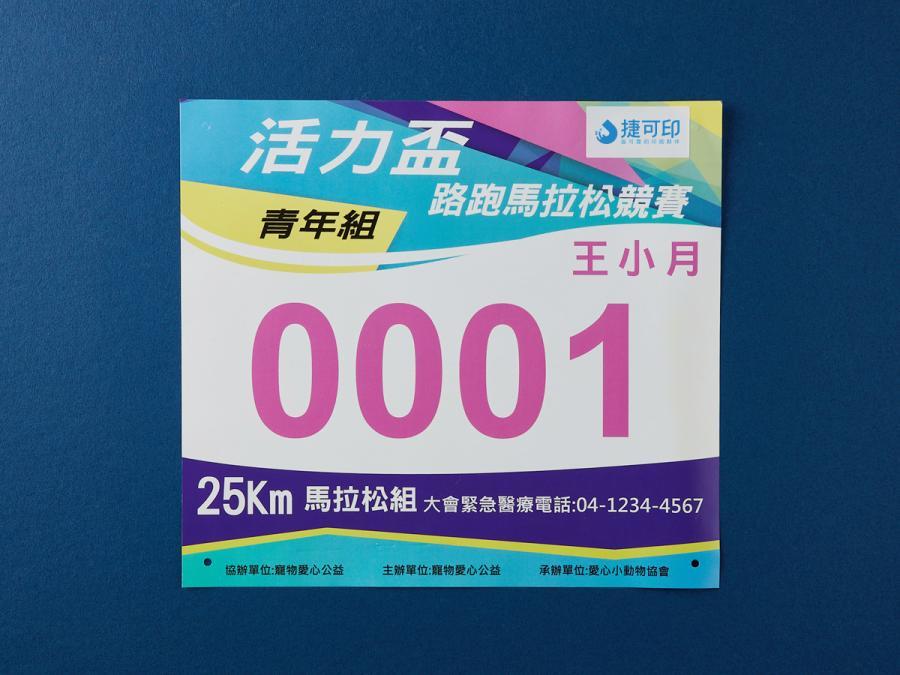 捷可印印製的競賽號碼布色彩鮮豔、耐磨、不易破、防水不掉墨,優於業界品質。且可製作高達四種變數資料,比如號碼、人名、組別、隊名之類的皆可不一樣!已承接多起著名運動賽事號碼布製作經驗,專業用心的製作,讓各項運動賽事安心舉辦!