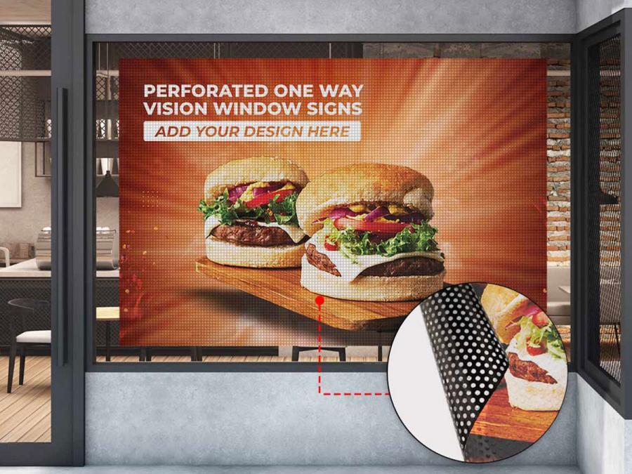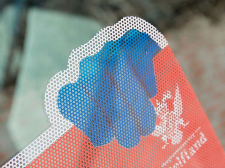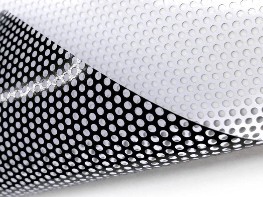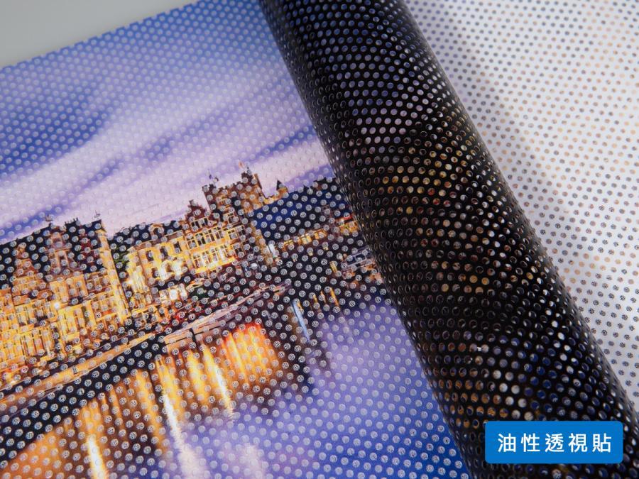 表面有規律性打孔,背面塗佈上黑色膠,藉此原理來提供單向透視效果,有隱密性。正面噴繪圖案看不到後面景物,背面無圖案部份可往外看穿。